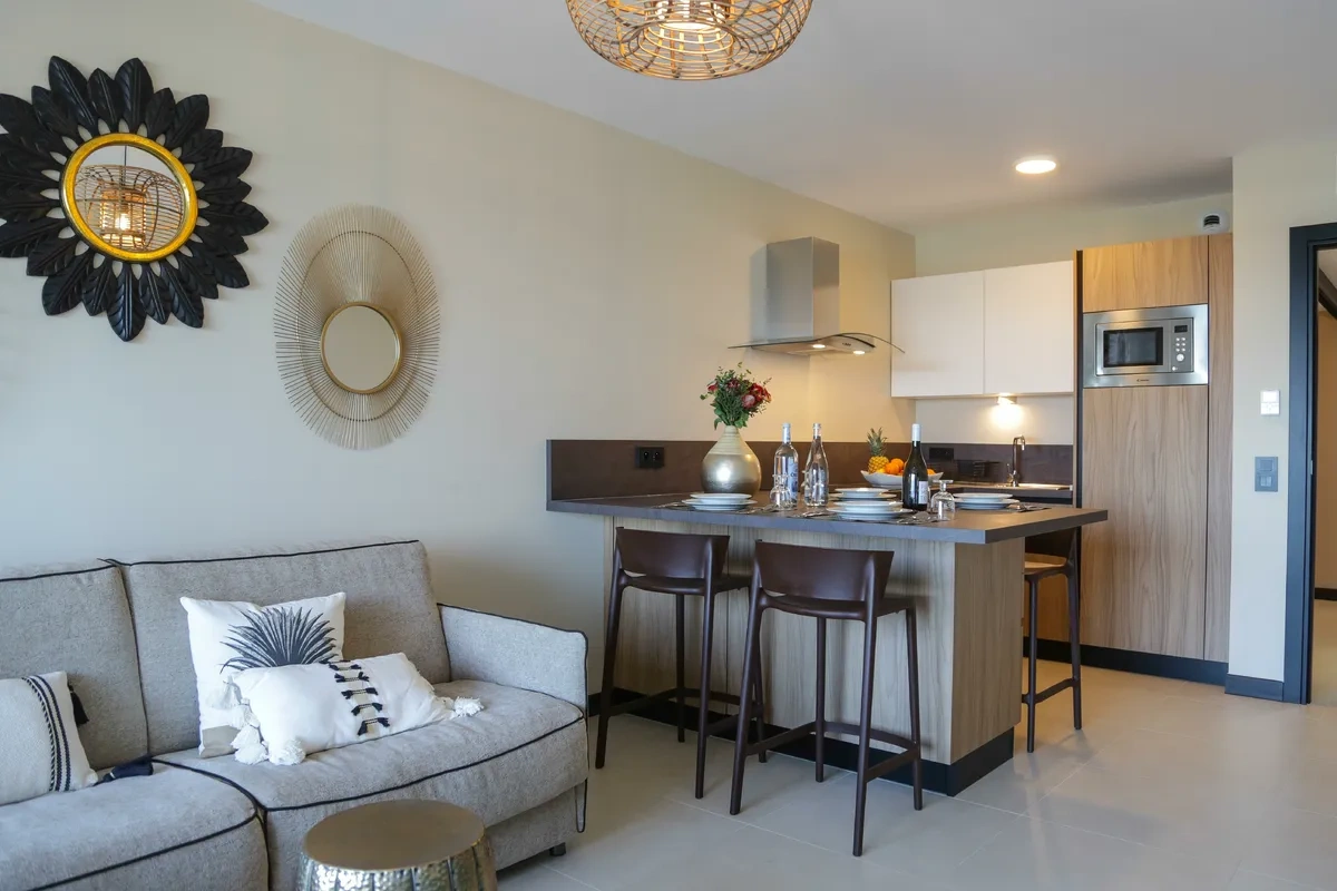 Avec ses 40 m² baignés de lumière, Funtanella est une invitation à ralentir. Pensée pour deux, mais prête à accueillir jusqu’à quatre personnes, cette suite offre une chambre avec dressing, une salle de bain à l’italienne, un salon avec canapé convertible et une cuisine ouverte où préparer les instants simples du quotidien. Derrière les baies vitrées, la mer s’étend à perte de vue. Sur la terrasse, on savoure un café face à l’horizon, on s’attarde au coucher du soleil. Tout y est paisible, fluide, naturel. Comme si le temps s’accordait à votre rythme. Six appartements de cette catégorie sont accessibles aux personnes à mobilité réduite.